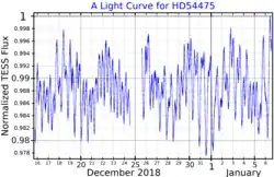 HD 54475 has been classified as a slowly pulsating B-type star,[6] but it has not been formally named as a variable star. The General Catalogue of Variable Stars lists it as a suspected variable with an amplitude of less than a tenth of a magnitude.[11]