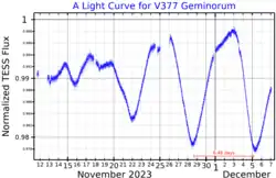 ![]() A light curve for V377 Geminorum, plotted from TESS data,[1] with the 6.46 day rotation period shown in red, | |