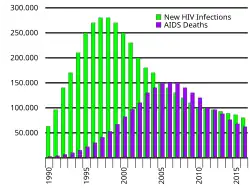 HIV/AIDS in India is an epidemic. The National AIDS Control Organisation (NACO) estimated that 3.14 million people lived with HIV/AIDS in India in 2023.[1] Despite being home to the world's third-largest population of persons with HIV/AIDS (as of 2023, with South Africa and Nigeria having more),[2] the AIDS prevalence rate in India is lower than that of many other countries. In 2016, India's AIDS prevalence rate stood at approximately 0.30%—the 80th highest in the world.[3] Treatment of HIV/AIDS is via a combination of antiretroviral drugs and education programs to help people avoid infection.
