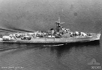 HMAS Shoalhaven (K535/M535/F535), named for the Shoalhaven River in New South Wales, was a modified River-class frigate of the Royal Australian Navy. She was laid down by Walkers at Maryborough on 18 December 1943, launched on 14 December 1944 by Senator Dorothy Tangney and commissioned at Urangan Pier in Hervey Bay in Queensland on 2 May 1946. Her first commander was Commander Rodney Rhoades.[2]