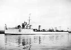 The destroyer's main armament consisted of a BL 4-inch Mark VIII gun, supplemented by three QF 12-pounder 12 cwt guns.[1] This was supplemented by three single 18 inch (450 mm) torpedo tubes and three .303-inch machine guns.[1] Later in the ship's career, two depth charge throwers and four depth charge chutes were installed.[2]
