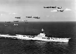 The carrier sailed from Devonport on 12 April 1949, carrying the 20th CAG.[24] Sydney arrived at Jervis Bay on 25 May, where the aircraft of the 20th CAG and training equipment were offloaded for transport to the new naval air station, HMAS Albatross, before the carrier proceeded to her namesake city.[25] Sydney arrived in Sydney on 2 June, and took over as Flagship of the Australian Fleet from HMAS Australia on 25 August.[26][27] 20th CAG was reembarked during August, and Sydney exercised in Australian and New Guinea waters until late November.[26] From January to April 1950, the carrier continued training exercises and visited ports in south-east Australia and New Zealand, and on 7 June, she departed for England to collect the 21st CAG.[28] The 21st CAG embarked in October, and the carrier returned to Australia in December.[28] Before Sydney departed in late October, the British Admiralty suggested that she be deployed to the Korean War as relief for HMS Theseus and her worn-out catapult, but this was withdrawn because of the plan's drawbacks.[29]