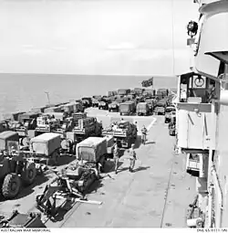 In March 1951, the First Sea Lord requested that Sydney be deployed to Korea while HMS Glory was refitted in Australia, to maintain a Commonwealth carrier presence.[33][34] This was agreed to, and a 38-strong wartime CAG was formed on 14 May by incorporating the Sea Furies of 805 Squadron into the 21st CAG.[12] Because RAN Fireflies were optimised for anti-submarine warfare, and consequently not fitted with cannon, cannon-equipped RN aircraft were loaned for the duration of Sydney's deployment.[35] After completing pre-departure exercises, during which several aircraft were destroyed in non-fatal, weather-induced deck crashes, Sydney and the destroyer HMAS Tobruk sailed for Korea on 31 August.[33] While en route, the carrier's aircraft were used for a fly-past demonstration over Rabaul on 6 September, following civil unrest.[36] On her arrival, Sydney became the first aircraft carrier owned by a Commonwealth dominion to see wartime service.[34][b]