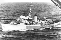 Flower-class corvettes like West York serving with the Royal Canadian Navy during the Second World War were different from earlier and more traditional sail-driven corvettes.[2][3][4] The "corvette" designation was created by the French as a class of small warships; the Royal Navy borrowed the term for a period but discontinued its use in 1877.[5] During the hurried preparations for war in the late 1930s, Winston Churchill reactivated the corvette class, needing a name for smaller ships used in an escort capacity, in this case based on a whaling ship design.[6] The generic name "flower" was used to designate the class of these ships, which – in the Royal Navy – were named after flowering plants.[7]