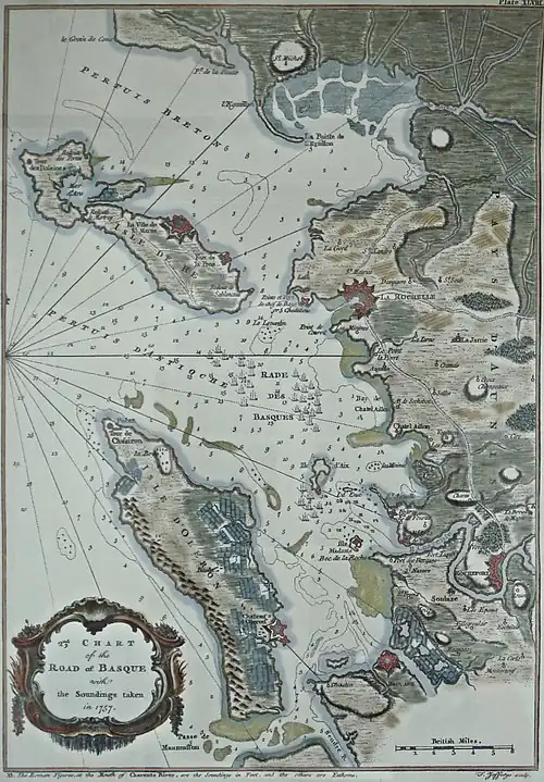 Actaeon finally put to sea in early March 1758, and was assigned to protect a flotilla of British troopships en route to Senegal as part of a British expedition to seize France's African possessions.[20] In late March, she was reassigned to a ten-vessel squadron under Admiral Edward Hawke, which was hunting French merchant convoys near the port of Rochefort.[21] One such convoy was sighted near the Île de Ré on 4 April but escaped before the British could draw near. However, later that day a second convoy was discovered in the nearby Basque Roads, comprising seven French naval vessels and forty merchant craft. Hawke ordered his squadron to engage but the water was too shallow for any of his ships to draw near; for their part the French made sail to flee towards the port of La Rochelle. In their haste, a number of the French vessels ran aground and could only be refloated after their crews had thrown their guns and stores overboard. The French marked the locations of this discarded equipment with buoys, but these were removed by Actaeon's crew. Around 80 buoys were destroyed before the ebbing tide forced the British boats away from the shore.[21]