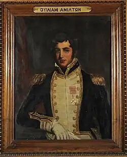 On 14 October 1827, Cambrian, still under Captain Hamilton, joined the allied fleet just outside the Bay of Navarino. On the 20th, she entered the bay with the rest of the fleet, where she took part in the Battle of Navarino. Cambrian's casualties were light; she had one crew member killed and one wounded.[4][26] For his role in the battle, Hamilton received the medal of the second class of the order of St. Anne of Russia and was made a member of the French order of St. Louis.[58] In 1847 the Admiralty authorized the issuance of the Naval General Service Medal with clasp "Navarino" to all surviving claimants from the action.