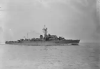 The Bay-class frigates were anti-aircraft versions of the Loch-class anti-submarine frigates intended for service in the Far East.[1] Carnarvon Bay displaced 1,600 long tons (1,600 t) at standard load and 2,420 long tons (2,460 t) at deep load. The ship had an overall length of 307 feet (93.6 m), a beam of 38 feet 7 inches (11.8 m) and a draught of 12 feet 9 inches (3.9 m).[2] She was powered by two vertical triple-expansion steam engines, each driving one shaft, using steam provided by two Admiralty three-drum boilers. The engines produced a total of 5,500 shaft horsepower (4,100 kW) and gave a maximum speed of 20 knots (37 km/h; 23 mph). Carnarvon Bay carried a maximum of 724 long tons (736 t) of fuel oil that gave her a range of 9,500 nautical miles (17,600 km; 10,900 mi) at 12 knots (22 km/h; 14 mph). The ship's complement was 157 officers and ratings.[1]