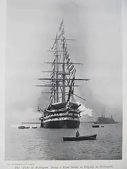 HMS Duke of Wellington was a 131-gun first-rate ship of the line of the Royal Navy. Launched in 1852, she was symptomatic of an era of rapid technological change in the navy, being powered both by sail and steam. An early steam-powered ship, she was still fitted with towering masts and trim square-set yards, and was the flagship of Sir Charles Napier.