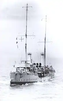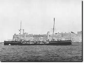 Harrier's first commission was spent on the Mediterranean Station. She deployed to Crete in February 1897 to operate as part of the International Squadron, a multinational force made up of ships of the Austro-Hungarian Navy, French Navy, Imperial German Navy, Italian Royal Navy (Regia Marina), Imperial Russian Navy, and Royal Navy that intervened in the 1897-1898 Greek uprising on Crete against rule by the Ottoman Empire. On 21 February 1897, she joined the British battleship HMS Revenge and torpedo gunboat HMS Dryad, the Russian battleship Imperator Aleksandr II, the Austro-Hungarian armored cruiser SMS Kaiserin und Königin Maria Theresia, and the German protected cruiser SMS Kaiserin Augusta in the International Squadron's first direct offensive action, a brief bombardment of Cretan insurgent positions on the heights east of Canea (now Chania) after the insurgents refused the squadron′s order to take down a Greek flag they had raised.[3][4]