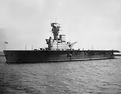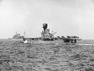 Captain the Honourable G. Fraser was appointed on 15 August 1934 as the new commanding officer and the ship began trials of the new equipment in early November.[30] At the same time the nine Fairey Seal torpedo bombers of 824 Squadron joined the ship.[31] Hermes left Portsmouth on 18 November for the China Station and arrived at Hong Kong on 4 January 1935.[30] The Hawker Osprey reconnaissance biplanes of 803 Squadron were transferred aboard from Eagle before that ship left Hong Kong.[32] Pirates captured a British-owned merchant ship, SS Tungchow, with 90 British and American children on board on 29 January and Hermes was ordered to search for the ship when she failed to arrive at Yantai at her scheduled time. Three Seals spotted her in Bias Bay on 1 February and the pirates abandoned the ship when it was found, leaving the passengers unharmed. Hermes remained in the vicinity of Hong Kong until mid-May when she steamed to Weihaiwei. There she remained until 12 September when the Admiralty decided to transfer her to Singapore where she was closer to East Africa in case a military response to the Italian invasion of Ethiopia was deemed necessary.[Note 1] The ship arrived on 19 September and remained in the area for the next five months.[33]