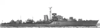 Two twin 4.5 inch (113 mm) Mark IV gun mounts, capable of elevating to 85 degrees, were mounted forward, while a single 4-inch gun was fitted behind the funnel for firing starshell.[8][9] Close-in anti aircraft consisted of eight Bofors 40 mm guns in four twin stabilised Hazemayer mounts, with two power-operated 2-pounder guns on the bridge wings.[10] Two quadruple 21 inch (533 mm) torpedo-tubes were fitted,[7] while four depth charge launchers and two racks were fitted, with 60 depth charges carried.[8] The ship had a crew of 247 officers and other ranks.[7]