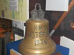 The ship mounted four 45-calibre 4.7-inch (120 mm) Mark IX guns in single mounts. For anti-aircraft (AA) defence, Hotspur had two quadruple Mark I mounts for the 0.5 inch Vickers Mark III machine gun. She was fitted with two above-water quadruple torpedo tube mounts for 21-inch (533 mm) torpedoes.[1] One depth charge rail and two throwers were fitted; 20 depth charges were originally carried, but this increased to 35 shortly after the war began.[3]