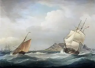 ![]() HMS Illustrious heading out of Table Bay (Thomas Whitcombe, cira 1811)