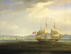 Mercury was fitted out as a troopship at Woolwich in mid-1810 and commissioned in May that year as a 16-gun troopship under Lieutenant William Webb.[1] Commander John Tancock succeeded Webb in mid-1810 and Mercury spent most of 1811 on the Lisbon station.[1][d] Commander Clement Milward took over in November 1811 and went out to the Leeward Islands. Mercury's last commanding officer was Commander Sir John Charles Richardson, who took over while she was still in the Leewards.[1]