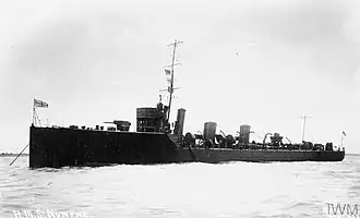 Armament consisted of two single BL 4 in (102 mm) Mk VIII guns, one carried on the forecastle and another aft. Two single QF 12-pounder 3 in (76 mm) guns were mounted between the first two funnels.[8] Two rotating 21-inch (533 mm) torpedo tubes were mounted aft of the funnels, with two reloads carried, and a searchlight fitted between the tubes.[9] The destroyer was later modified to carry a single Vickers QF 3-pounder 2 in (47 mm) anti-aircraft gun and depth charges for anti-submarine warfare.[10] The ship's complement was 72 officers and ratings.[6]
