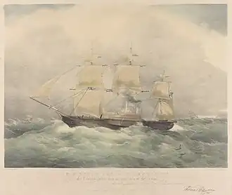 In September 1843 Penelope joined a royal squadron near Walmer Castle in Kent. It had the royal yacht HMY Victoria and Albert (1843), with Queen Victoria and Prince Albert on board and several other steam vessels including HMS Cyclops. The royal yacht brought the queen to Ostend on 13 September. The squadron continued and arrived in Vlissingen on 14 September, and then in Antwerp on the 15th. After visiting Bruges, Ghent and Brussels, Victoria visited Antwerp, where she embarked on her yacht and left on 20 September. While Penelope was in Antwerp she was visited by the Dutch Lieutenant Willem Huyssen van Kattendijke, an ADC to the director of the Dutch navy. He spoke to several officers of Penelope, and wrote an article about her.[17] After first citing an article in the Annales Maritimes,[18] he noted that the depth of Penelope was 21.5 feet (6.6 m) before Antwerp, that she made 9 knots (17 km/h; 10 mph) in good circumstances, but only 7–8 knots (13–15 km/h; 8.1–9.2 mph) in bad weather. Also that the weight of the machinery and coal, together 1,035 tons, was not in line with the displacement allowed by the added mid-section. He also claimed that her officers did not agree with the idea that she could transport a 1,000 soldiers to the Cape. Van Kattendijke concluded that it was clear that the experiment had not been as successful as had been hoped, but applauded the daring of the designers.