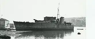 In March 1943 she was towed to Oran, where she was declared a total loss.[2] French dockworkers there cut the damaged ship into two halves before a decision was made to strip them of all guns, ammunition, mountings, stores, etc., and tow them to Britain. The two parts were ballasted and brought to Portsmouth in June.[5]