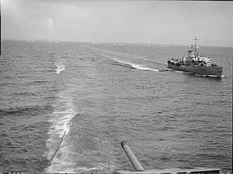 In November 1942, the British and Americans landed in French North Africa in Operation Torch, with Rhododendron helping to escort one of the convoys carrying invasion forces from Britain to the Centre Task Force beaches at Arzew near Oran in Algeria on 9 November.[11] On 4 July 1943, she picked up more than 300 survivors from several merchant ships which were torpedoed by German submarines U-409 and U-375 off of Algeria.