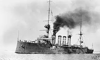 The squadron was assigned to the Grand Fleet in mid-1914 as the Navy mobilised for war. It spent much of its time with the Grand Fleet reinforcing the patrols near the Shetland and Faeroe Islands and the Norwegian coast[12] where she captured a German merchantman on 6 August.[11] On 18 June 1915, Roxburgh was part of a force of cruisers from the 3rd Cruiser Squadron and the 2nd Light Cruiser Squadron, accompanied by destroyers, that set out from Rosyth on a patrol across the North Sea. The force was attacked several times by German submarines, and Roxburgh was hit in the bow by a single torpedo from SM U-38 on 20 June, but managed to return to Rosyth under her own power.[13] The ship was under repair until April 1916. She patrolled the Norwegian coast in April 1916 and was then transferred to the North America and West Indies Station in September for convoy escort duties.[11] On 13 February 1918 Roxburgh rammed and sank the German submarine SM U-89 north of Malin Head, Ireland, with no survivors.[14] The ship was reduced to reserve at Plymouth Royal Dockyard in June 1919, but was recommissioned later that year for use as a radio training ship. Roxburgh was paid off in February 1920 and sold for scrap on 8 November 1921.[8]