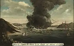 On 29 October Dona Maria II, Dom João I, and Iris were in Macau Roads, off Taipa. The sloop-of-war USS Marion was nearby. The vessels fired a salute at noon on occasion of the birthday of Ferdinand II of Portugal.[21] At 2:30 p.m. Dona Maria II exploded and sank. Dom João I, Iris, and Marion sent their boats, but they were only able to rescue a few men, some of whom subsequently died.[21] The first reports were that some 200 lives had been lost.[22]