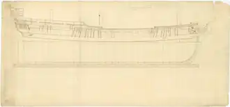 Solebay was one of three Royal Navy vessels designed according to a 1760 schematic drawn up by Sir Thomas Slade, a naval architect and newly appointed Surveyor of the Navy. Slade had been impressed with the sailing qualities of a captured French vessel, Abénaquise, and used this vessel as his template for Solebay with modifications to incorporate a heavier hull and better sailing qualities in poor weather. His plans for the new 28-gun sixth-rate were approved by Admiralty on 30 January 1762.[1] At the time, the Royal Dockyards were fully engaged in maintaining and fitting-out the Navy's ships of the line.[2] Consequently, the contracts for Solebay were issued to a private shipyard, Thomas Airey and Company of Newcastle-upon-Tyne, with a requirement that the vessel be completed within 14 months at a cost of £9.3s per ton burthen.[1]