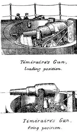 Her armament was partly conventional, being deployed on the broadside, and partly experimental. She was the first British ship to use barbettes of any kind, with the barbettes located on the midline on the upper deck. The armament consisted of four 11-inch muzzle-loading guns, one each on the forecastle and stern, and one each at the forward corners of the central battery to port and starboard. The 11-inch guns were installed on a Moncrieff mount, which had a mechanism for raising and lowering the gun. The mount was on a massive turntable that provided enough space for the hydraulic ramrod. The loading and lifting process, as well as the rotation of the mount, were operated by a disguised stand with four control levers. When the gun was extended and aimed at the target, it was adjusted to elevation graduated in degrees by a rod linkage on each side of the breech. A full gun crew consisted of six men, but the guns could be operated by three in an emergency. In addition, four 10in muzzle-loading guns were located in the rear of the central battery, two on each broadside. To protect against attack by boats armed with torpedoes, the ship received four 20-pounder breech-loading guns. Temeraire was also fitted with two launchers for spar torpedoes. In 1884, the 20-pounders were replaced by four 25-pounder breech-loading guns, and four 3-pounder Hotchkiss and ten 3-pounder Nordenfelt QF guns were also added to the ship.[2][1]