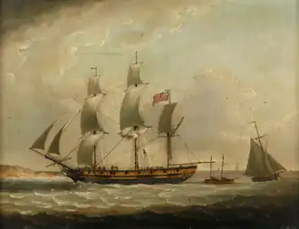 Vestal was commissioned under the command of Captain James Shirley about the time of her launching, before the ship had been coppered.[1][5] The post ship sailed to join the Newfoundland station in about July the same year, departing Plymouth as escort to a large convoy on 18 July.[6] The ship arrived at St Johns with her convoy on 26 August and was then sent out by Vice-Admiral John Montagu on a cruise.[7] While subsequently sailing off the coast of Newfoundland Vestal disappeared. It was presumed that she had foundered with all hands in a gale on about 31 October.[1][8] The 14-gun ship sloop HMS Pegasus also disappeared off Newfoundland in October, and was similarly thought to have been lost in a storm as she attempted to make shore.[9][10]
