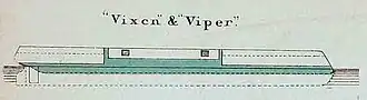 Viper was an armoured gunboat of the breastwork type. Her hull was of iron construction, with 10 in (25 cm) of teak backing.[1] Vertical trunks were provided at the stern to lift the screws clear of the hull, thereby allowing a better hull-form for purely wind-driven sailing.