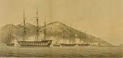 Wellesley saw active service in the Far East during the First Opium War. Led by Commodore Gordon Bremer in Wellesley, a British expedition captured Chusan in July 1840 after an exchange of gunfire with shore batteries that caused only minor casualties to the British.[4] When she returned from this service, some 27 cannonballs were found embedded in her sides.