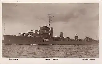 HMS Wren (D88/I88) was an Admiralty modified W class destroyer built for the Royal Navy. She was ordered in April 1918 from Yarrow Shipbuilders Limited under the 13th Order for Destroyers of the Emergency War Program of 1918–19. She was the third Royal Navy ship to carry the name, which was introduced in 1653.[1]
