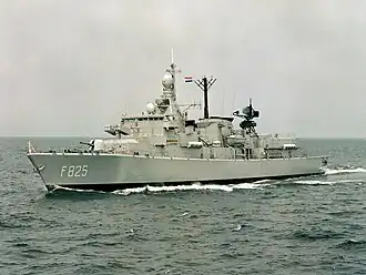 In 1988, she made a trip to the Far East and Australia to show the flag and for training, with the frigates Kortenaer & Witte de With and the replenishment ship Zuiderkruis.[5] From March-October 1993, she was deployed in the Adriatic Sea, supporting NATO and UN operations in Yugoslavia.[6]