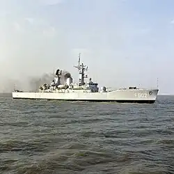 A twin 4.5-inch (113 mm) Mark 6 gun mount was fitted forward. Anti-aircraft defence was provided by two quadruple Sea Cat surface-to-air missile launchers on the hangar roof. A Limbo anti-submarine mortar was fitted aft to provide a short-range anti-submarine capability, while a hangar and helicopter deck allowed a single Westland Wasp helicopter to be operated, for longer range anti-submarine and anti-surface operations.[4][5]
