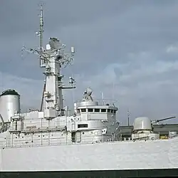 As built, Van Speijk was fitted with a Signaal LW-03 long range air search radar on the ship's mainmast, with a DA02 medium range air/surface surveillance radar carried on the ship's foremast. M44 and M45 fire control radars were provided for the Seacat missiles and ships guns respectively.[4][6] The ship had a sonar suite of Type 170B attack sonar and Type 162 bottom search sonar.[4] The ship had a crew of 251, later reduced to 180.[4][1]