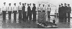 After arriving in the United Kingdom, many members of Draug's crew were transferred to Royal Navy ships and would serve aboard them during the remainder of the Norwegian Campaign.[23] Draug's second-in-command, Lieutenant Østervold served as a liaison officer aboard the British light cruiser HMS Manchester during the April–May 1940 Namsos landings in Mid-Norway.[24] The Chief Engineer on board, Kapteinløytnant (Lieutenant) B. M. Frimannslund, was left in command of the ship with 10-20 technical staff remaining to do maintenance work.[21] At 18:00 on 7 May 1940 Draug departed Scapa Flow for Portsmouth.[25]