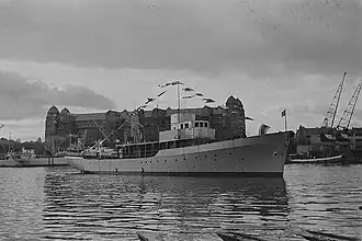 ![]() HNoMS Rauma just after launch in Oslo, 26 September 1939. Havnelageret in the background.