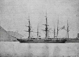 Gefle was named after the Swedish city Gävle. She was sent on several long expeditions abroad during the years 1863–1881. For example, Gefle journey to the Mediterranean Sea and West Africa in 1864–1865, and again to the Mediterranean in 1867–1868. In 1877–1878 she sailed to South America.[1][2] During the 1864–1865 expedition, future admiral and marine artist Jacob Hägg served onboard, and later illustrated a travelogue from the trip.[5] In 1870, Gefle was dispatched to Le Havre to evacuate Swedish citizens after the outbreak of the Franco-Prussian War.[2]