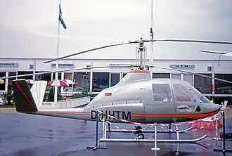 The final development was the Skyrider, which enclosed the Skytrac into a full fuselage with seating for four. Mockups of this configuration were displayed at the Hanover and Cannes airshows in 1972. A prototype was exhibited at the June 1973 Paris Air Show and flown in February 1974. It was possible to convert the basic Skytrac into a Skyrider in a matter of only a few hours' work. By the following year, however, HTM was out of business, and no further examples of their helicopter designs were ever constructed.