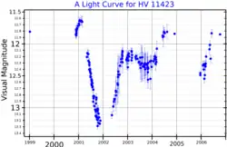 HV 11423 is one of the largest known stars with an estimated radius over 1,000 times larger than the sun. It is also a variable star with a variation of up 2 magnitudes at visual wavelengths but essentially constant in the infrared. It is listed in the General Catalogue of Variable Stars as a slow irregular variable, but a period of 720 days has been calculated, as well as a long secondary period of 1,817 days.[9]
