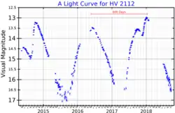 In 1966, analysis of Magellanic Cloud variable stars showed that HV 2112 had a photographic magnitude range from 13.0 to below 17.8. It was classified as a long-period variable, now known as a Mira variable, on the basis of its large amplitude and reasonably regular light variations, with a period of about 600 days.[14][15]