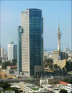HaYovel Tower[1][2][3] (Hebrew: מגדל היובל, lit. 'Jubilee Tower') also known as Kiryat HaMemshala Tower (Hebrew: מגדל קריית הממשלה, lit. 'Government Complex Tower') is a skyscraper in Tel Aviv, Israel. At 158 m (42 floors), it is the 20th tallest building in Israel. Construction was completed in 2005 on land previously belonging to the IDF HaKirya base. The tower is located near the Tel Aviv's tallest skyscraper cluster, the Azrieli Center complex, and is occupied largely by government offices. The consolidation of many of these offices in the tower, which were previously spread out all over the Tel Aviv district, allowed the release of a considerable amount of high-value government land to private development, as well as introducing efficiencies from housing many government functions under one roof. The tower has a helipad on its roof. It was originally planned to have 28 floors for government functions only, with the additional 14 floors being approved during construction. 13 of these top floors were approved for use by private sector offices, and the top 11 floors have floor-to ceiling windows. An external elevator serves the uppermost floors, and an underpass connects the building with the tower's underground parking. The rent being paid by the government is $16/square metre per month for the next 20 years.
