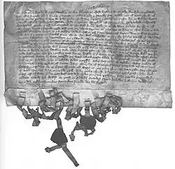 Barely a year later, representatives of the cities and the general public assembled at Båhus Castle, where they hailed Haakon as their king and took the oath of perpetual fealty and servitude to him.[2][3] Though the meeting at Båhus Castle forged historic ties to the old elective monarchy in Norway, the acclamation documents created by the Council of the Realm stipulated that Haakon was to rule over only parts of Norway, and it was also carefully documented that the Norwegian Law of Succession would apply if he were to die leaving no legitimate son, thereby ensuring that the hereditary monarchy would be upheld.[2][3][9][10] The next in line to the Norwegian throne would then be his older brother Eric and his descendants, but the provision became moot when Eric died in 1359.[2] The meetings at Varberg Castle in 1343 and at Båhus Castle in 1344 were later properly ratified in another meeting in the port city of Bergen as late as 1350.[2]