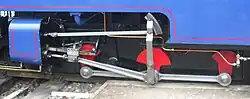 The Hackworth valve gear is a design of valve gear used to regulate the flow of steam to the pistons in steam engines. It is a radial gear, with an actuating lever driven from the crank. The drive may be taken directly from the crank or indirectly via a return crank (as in all pictures). The other end of the actuating lever is attached to a die block which slides in a slotted link. When the link is vertical, the engine is in mid-gear. Forward, reverse and cut-off adjustments are made by moving the link away from the vertical. The valve rod is pivoted to a point on the actuating lever.[1]