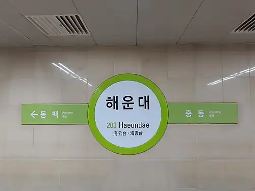 Haeundae station (Korean: 해운대역) is a station on the Busan Metro Line 2 in U-dong, Haeundae District, Busan, South Korea.[1] The station is unrelated to the Sinhaeundae station operated by Korail.