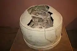 Excavations at Haft Tepe revealed a large funerary complex founded by Tepti-Ahar where the god Kirwashir (Kirmasir) was worshiped. It had two large mud-brick platforms, a workshop area and a probable palace. Beneath a large rectangular courtyard lay a subterranean funerary complex intended for the king and his family.[3] The two tombs, including that of the king, featured an oval vaulted roof, built of baked brick with gypsum mortar. The tomb of Tepti-Ahar measured 10 meters in length, 3.25 meters in width, and 3.75 meters in height.[4] Skeletal remains were found in the tomb, though it is not certain they belong to royalty.[5] [6] Another large structure found at the site was perhaps the foundations of a ziggurat, along with courtyards and suites of rooms. The funerary complex was decorated with bronze plates and wall paintings.[7] Several examples of terracotta sarcophagi generally called "bathtub coffins" were found.[8] Also found were several large stone stele one of which, written in contemporary Babylonian, detailed the funerary rites and duties including sacrifices to be made before the chariot of the god and of Tepti-Ahar.[9] Administrative texts belonging to the reign of Tepti-Ahar were also found at the site.[10]
