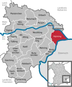 Haiming (German pronunciation: [ˈhaɪmɪŋ]) is a municipality in the district of Altötting in Bavaria in Germany, located between the rivers Inn and Salzach.