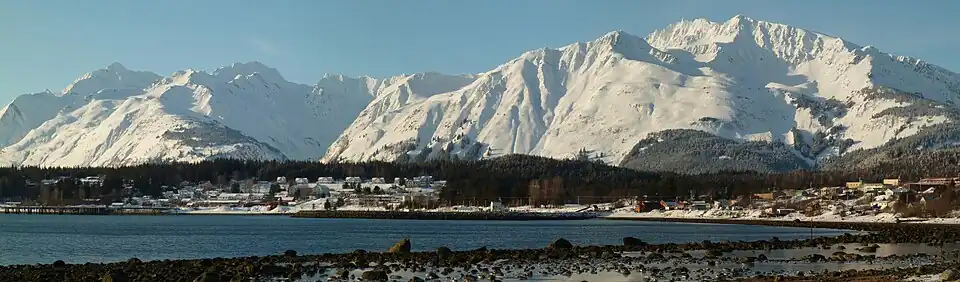 ![]() Haines, viewed from the northeast from Mount Ripinsky with Chilkoot Inlet on the left, Chilkat Inlet on the right, and the Chilkat Peninsula extending into the distance | |