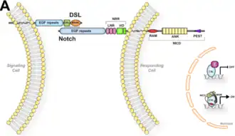 Hairless, also known as H, is a well-characterized Drosophila gene.[1] Since Hairless is a dominant loss of function mutation, many mutations to Hairless are embryonic lethal, but there are several viable hairless mutants.[2] This specific Drosophila gene is involved in the Notch signaling pathway (NSP) by acting as a suppressor of the organism's Notch signaling.[3] This interaction of the NSP can be seen in Figure 1.