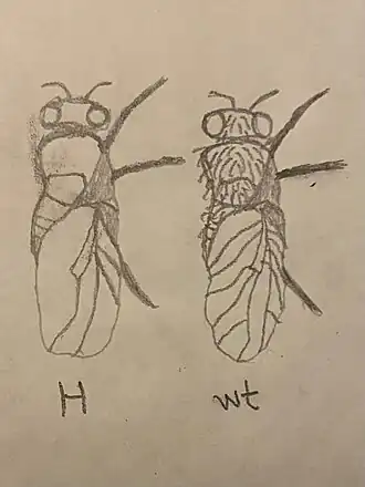 Hairless (H) encodes a hydrophilic protein that is composed of 1076 amino acids, and has a molecular weight of 110 kDa.[4] The H protein is reported in insects, and is found in nearly all of the family Drosophilidae.[4] It is also found in the family Culicidae, as well as the orders Lepidoptera, Hymenoptera, and Coleoptera.