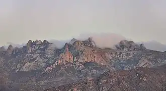 The twin peaks of Mashanig. The fallen pillar bridging the peaks is called "Mishifo". The left-hand tower is the highest point of the range. -