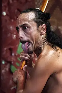 Various actions are employed in haka performance, including facial contortions such as showing the whites of the eyes (pūkana), and poking out the tongue (whetero, performed by men only),[5] and a wide variety of vigorous body actions such as slapping the hands against the body and stomping of the feet. The body serves as the instrument and vessel of delivery, with the key aspect being the words and the message they contain.[17]